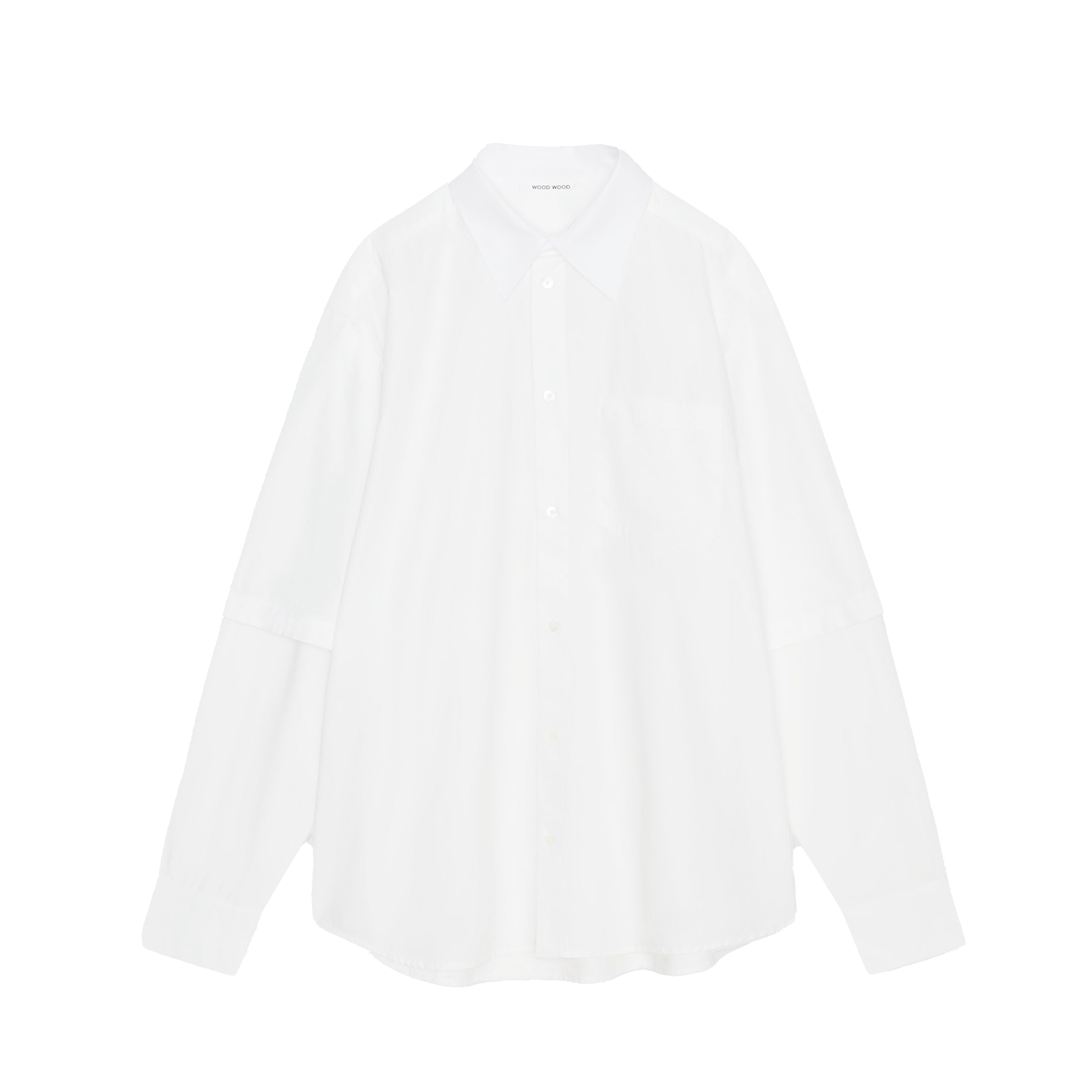 Dom DB Sleeve Shirt, a 100% cotton garment showcasing a unique layered shirt-over-shirt design. Featuring a classic collar and button closure, this shirt embodies versatile style. Its sleeves are adorned with buttons.