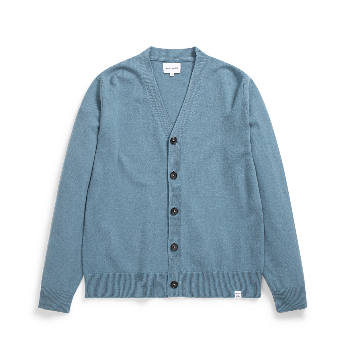 The Adam Merino Lambswool Cardigan is knitted from Italian lambswool yarn with a soft handfeel. It is finished with a single rib at hem and cuffs as well as a five-button placket.