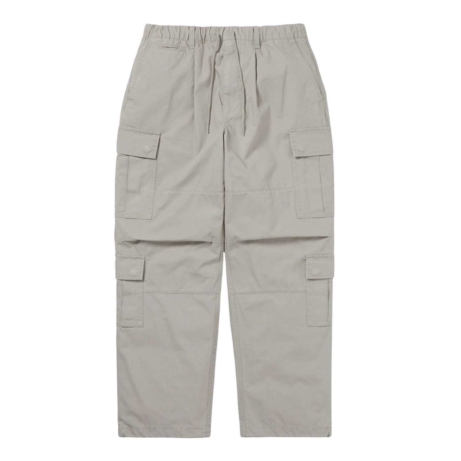 Practical elements like cargo pockets on both sides, a back flap pocket, and pleated knees enhance mobility and storage. A YKK #3 metal zip fly closure and elastic waistband ensure a secure, comfortable fit, while the drawcord hem allows for an adjustable silhouette. Reinforced hips provide added durability, and a design label on the back adds a subtle finishing touch.