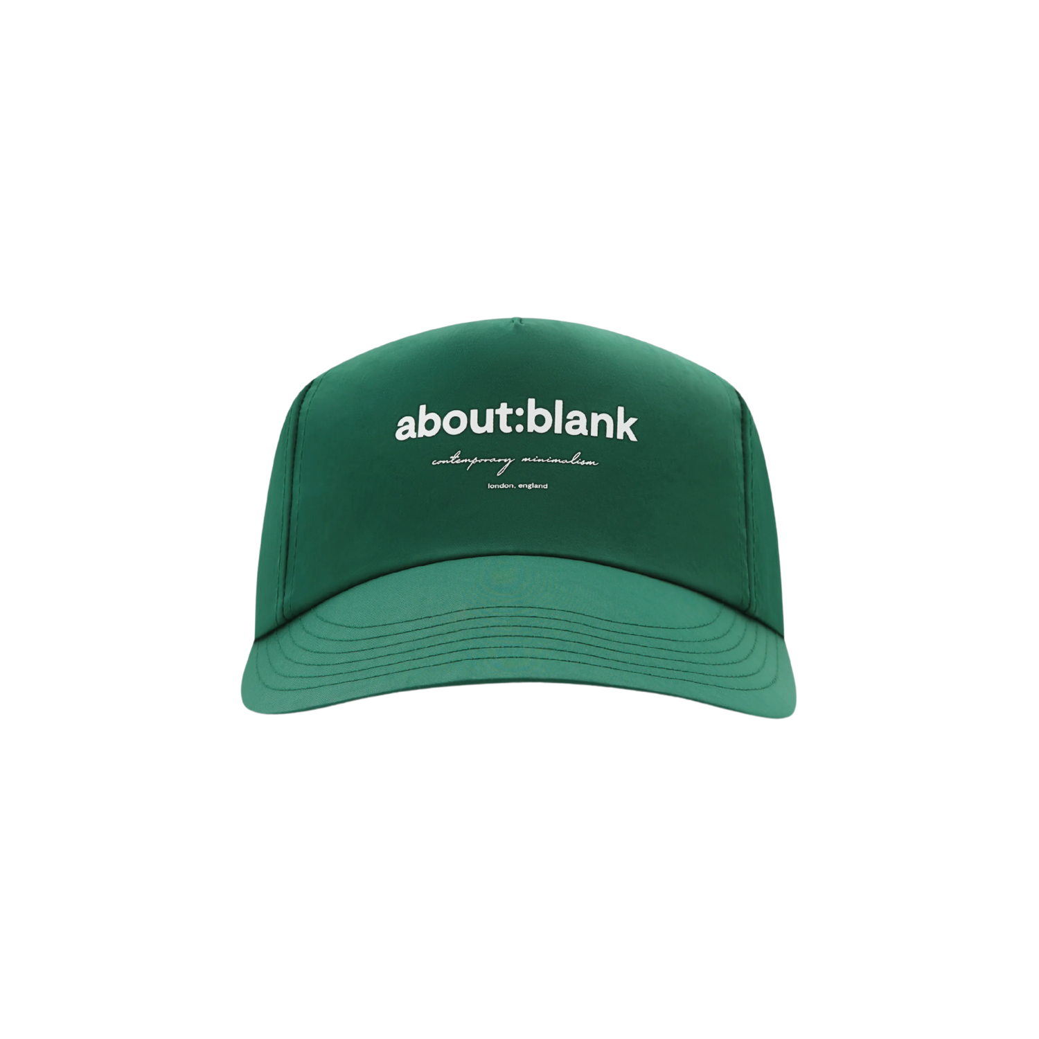 about:blank's new custom headwear silhouette – a structured 5-panel cap with a wide visor and more structured body. Made from lightweight nylon with a screen printed box logo at the front and metal strap adjuster at the back. Clean, breathable, and built to hold shape.