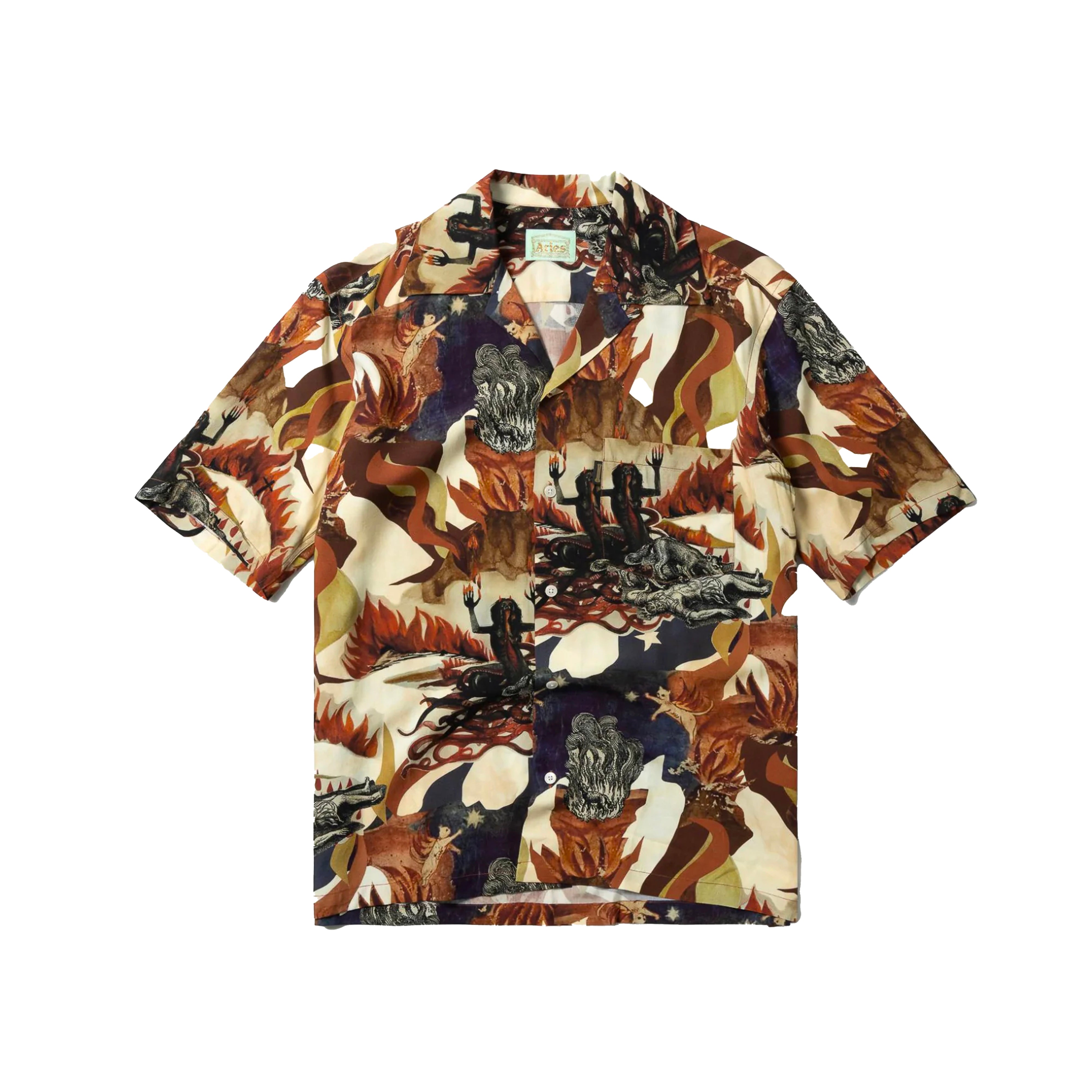 Unisex Hawaiian-style shirt with a camp collar in a soft rayon fabric. With an allover Aries' Cannibal Apocalypse print. 100% viscose. Made in Portugal.