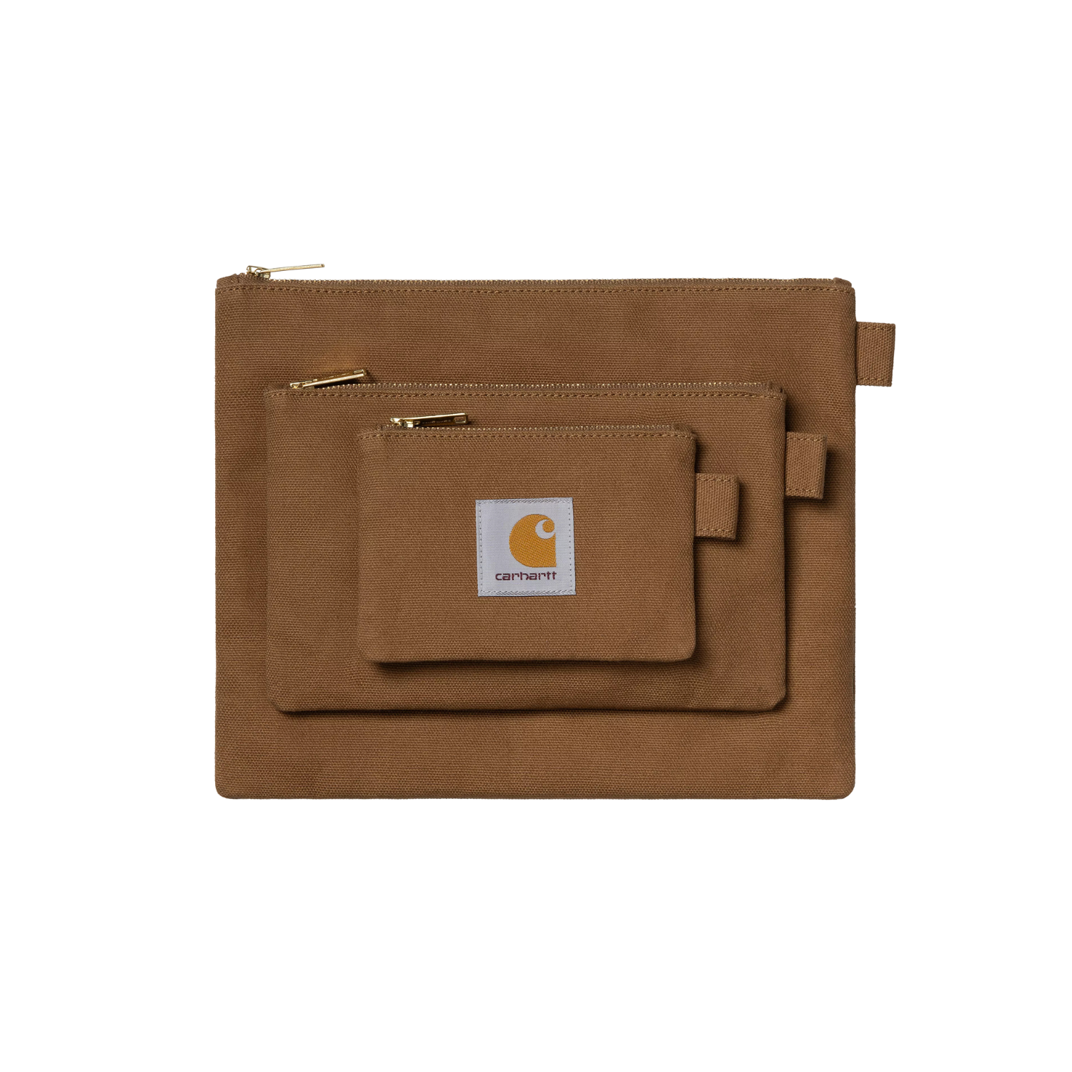 The Canvas Pouch Set comprises three pouches in different sizes, constructed from lined cotton Dearborn Canvas with a waxed finish. A woven Square Label appears on each piece.