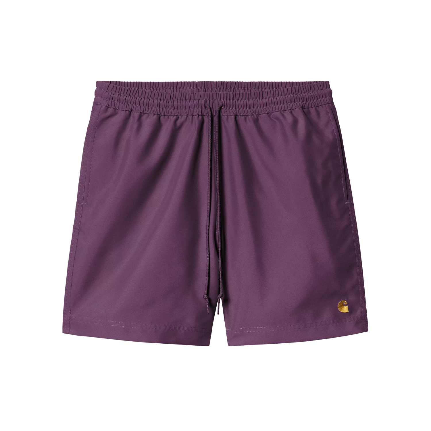 The Chase Swim Trunks are constructed from lightweight polyester fabric with water-repellent, fast-drying qualities. They also feature an inner mesh lining. The trunks have two side seam pockets, as well as a back pocket with a key holder. An embroidered 'C' Logo appears on the left leg.