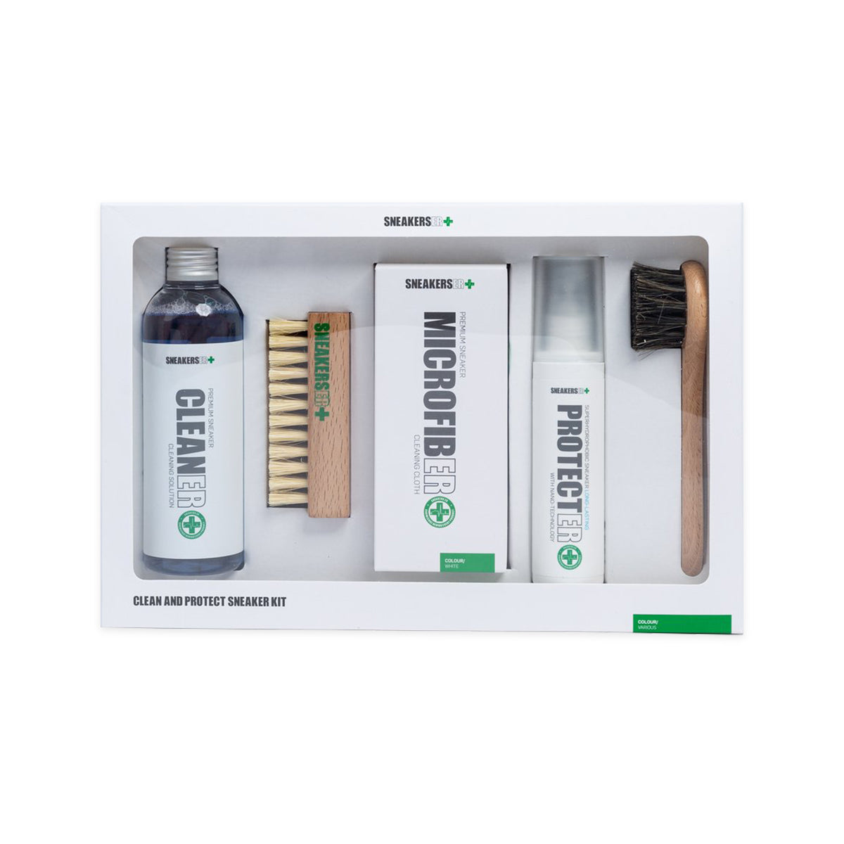 The Sneaker Clean & Protect kit contains everything you need. It has the; cleaning solution, cleaning brush, microfibre cloth, sneaker protector and sneaker protecter applicator brush.