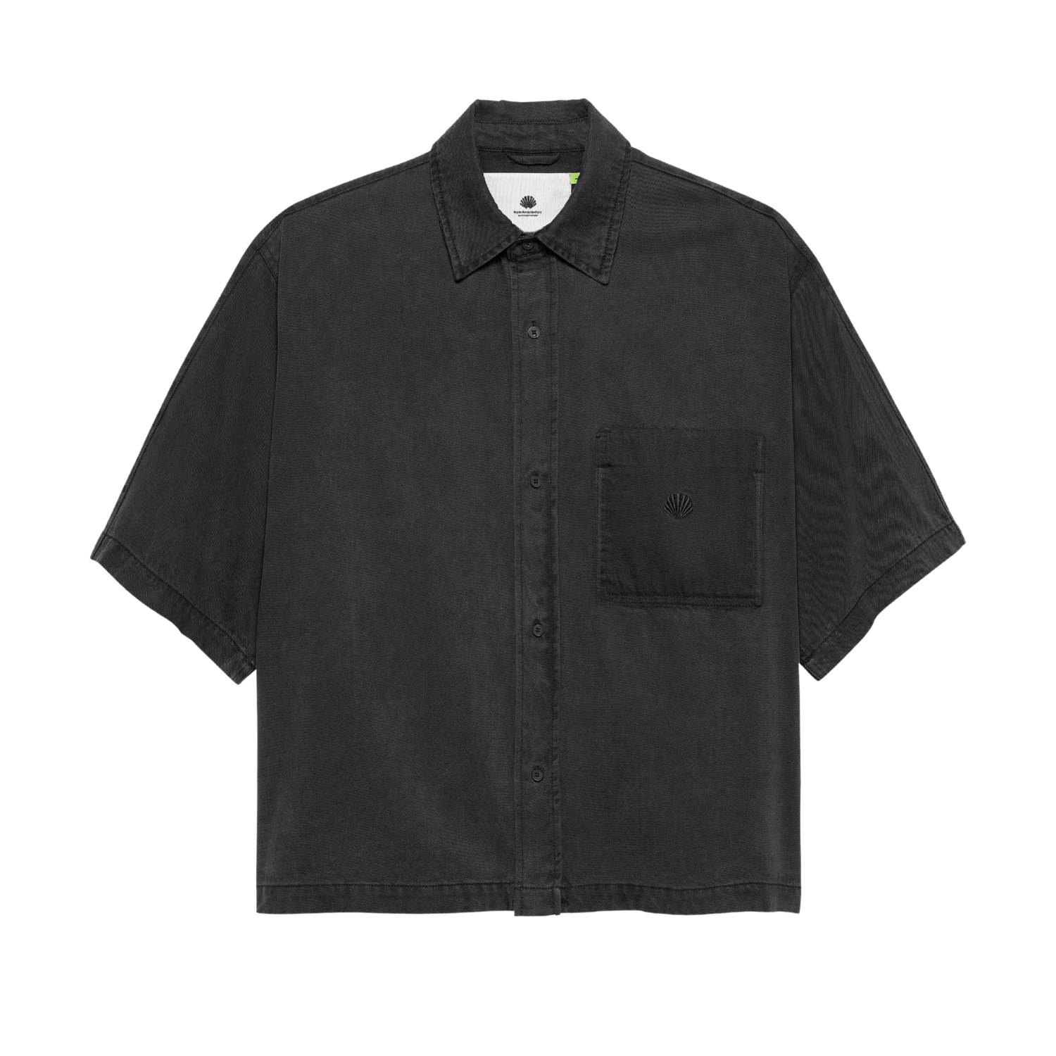 Button-up shirt is cut to a relaxed unisex fit with dropped shoulders and hip length. Complete with chest embroidery, chest pocket on the inside and centre front button-up closure. Made from cotton and lyocell fabric with washing.