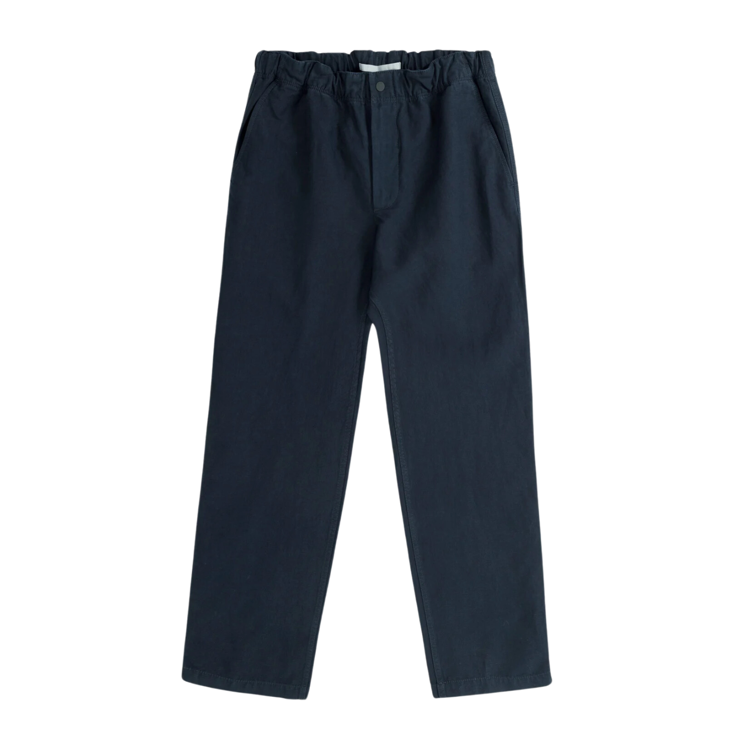 A relaxed fitting pant with a loose leg, and cut from mid-weight cotton linen cloth, The pants are garment-dyed for a rich colour. Finished with a zip fly, snap closure and drawstring waist.