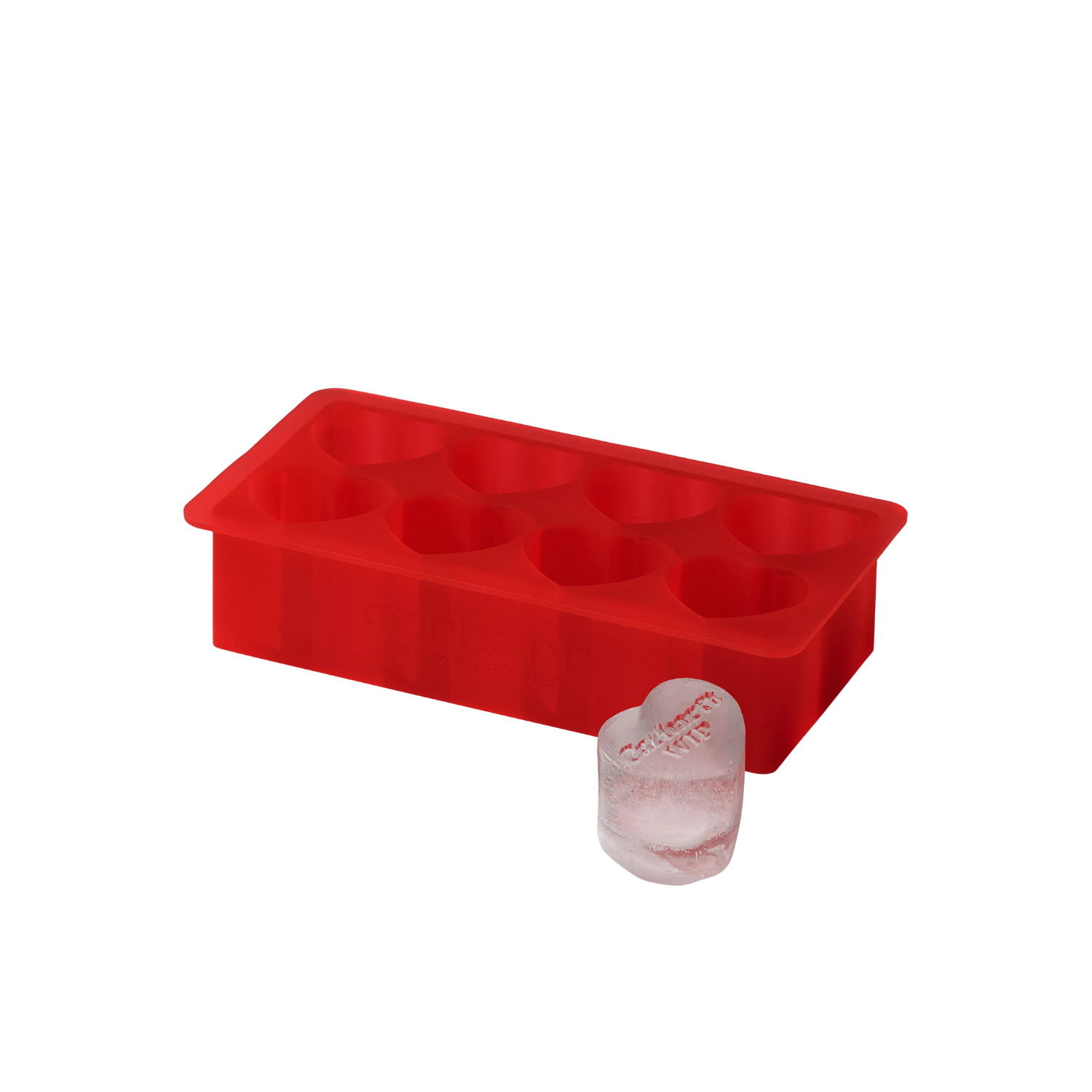 The Heart Ice Cube Tray is made from BPA-free silicone, featuring heart-shaped molds with embossed branding. The item is dishwasher safe.