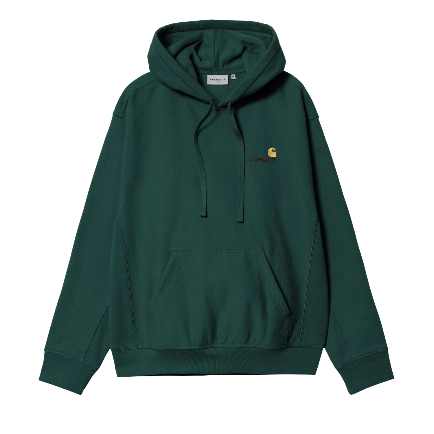 The Hooded American Script Sweatshirt is constructed from a cotton-polyester blend and brushed for extra softness and warmth without losing breathability. Features a kangaroo pocket. This garment has a loose, boxy silhouette.