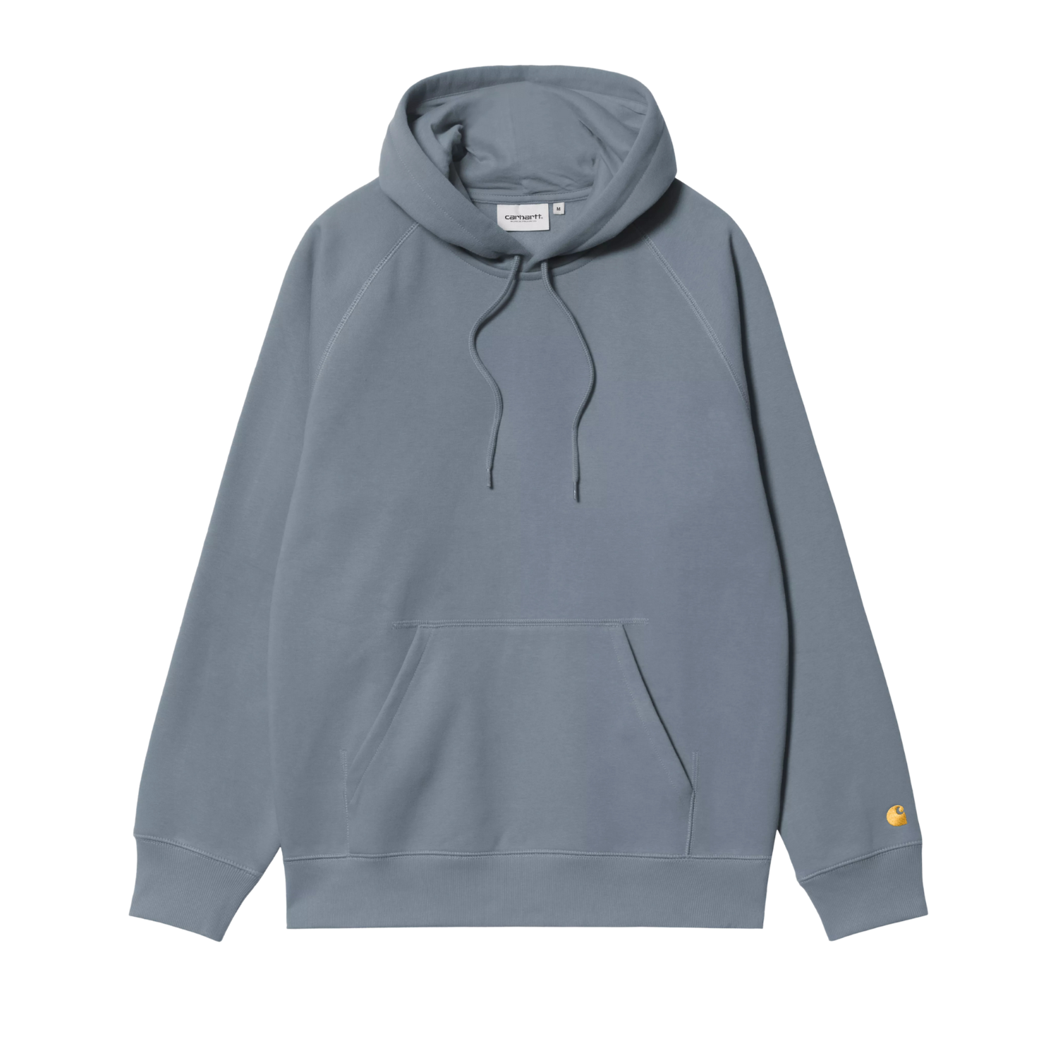 The Hooded Chase Sweatshirt is constructed from heavyweight polycotton fabric in a regular fit. The fabric has also been brushed, giving it a fleece-like backing. The item features raglan sleeves and is detailed with flatlock stitching. An embroidered 'C' Logo appears on the left sleeve.