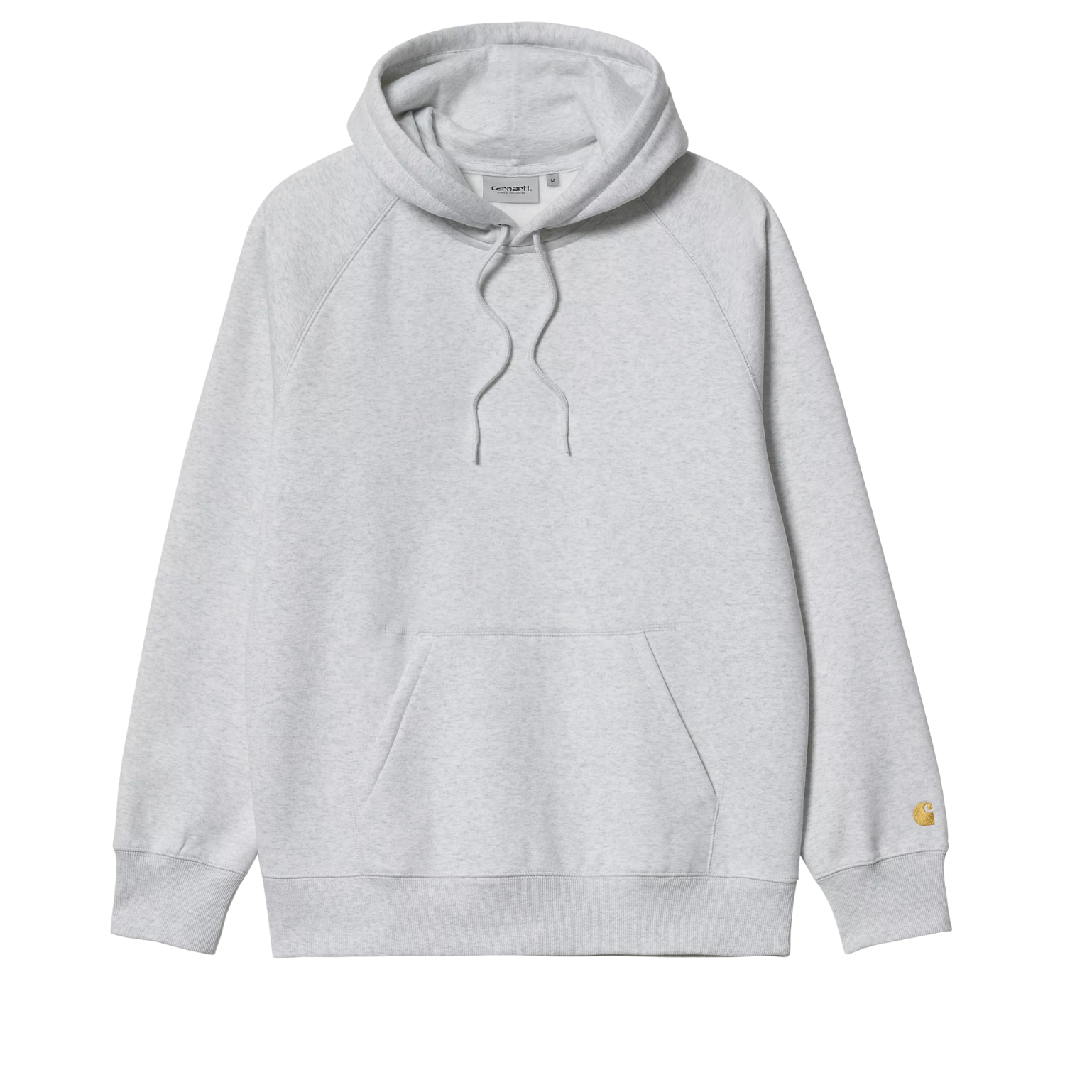 The Hooded Chase Sweatshirt is constructed from heavyweight polycotton fabric in a regular fit. The fabric has also been brushed, giving it a fleece-like backing. The item features raglan sleeves and is detailed with flatlock stitching. An embroidered 'C' Logo appears on the left sleeve.