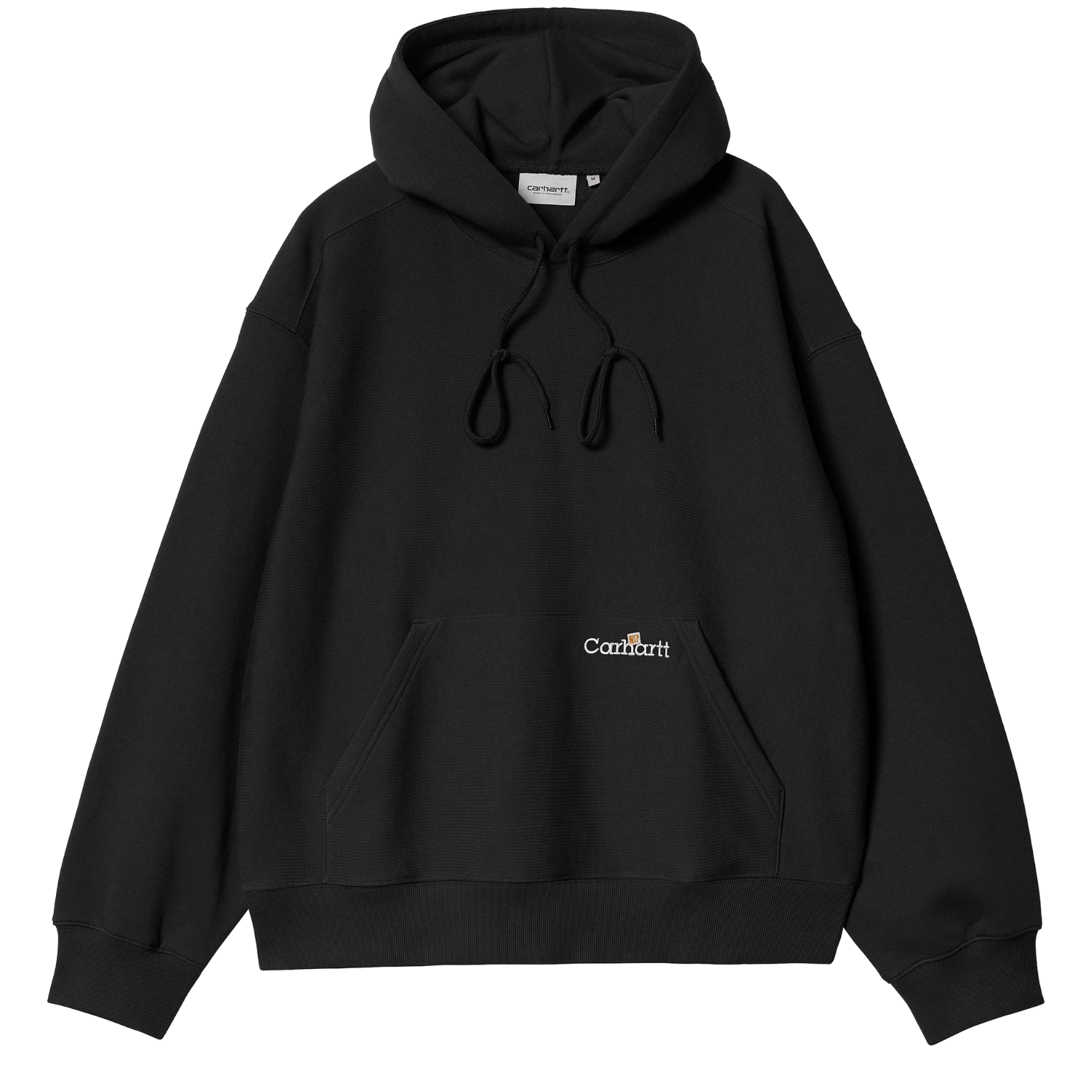 The Hooded Label Script Sweatshirt is made from a heavyweight, brushed cotton jersey with a fleece-like backing. The item has a balloon fit, which is a little looser and boxier, but also characterized by dropped shoulder and rib-knit trims, offering a cinching effect. Graphic embroidery appears on the front.