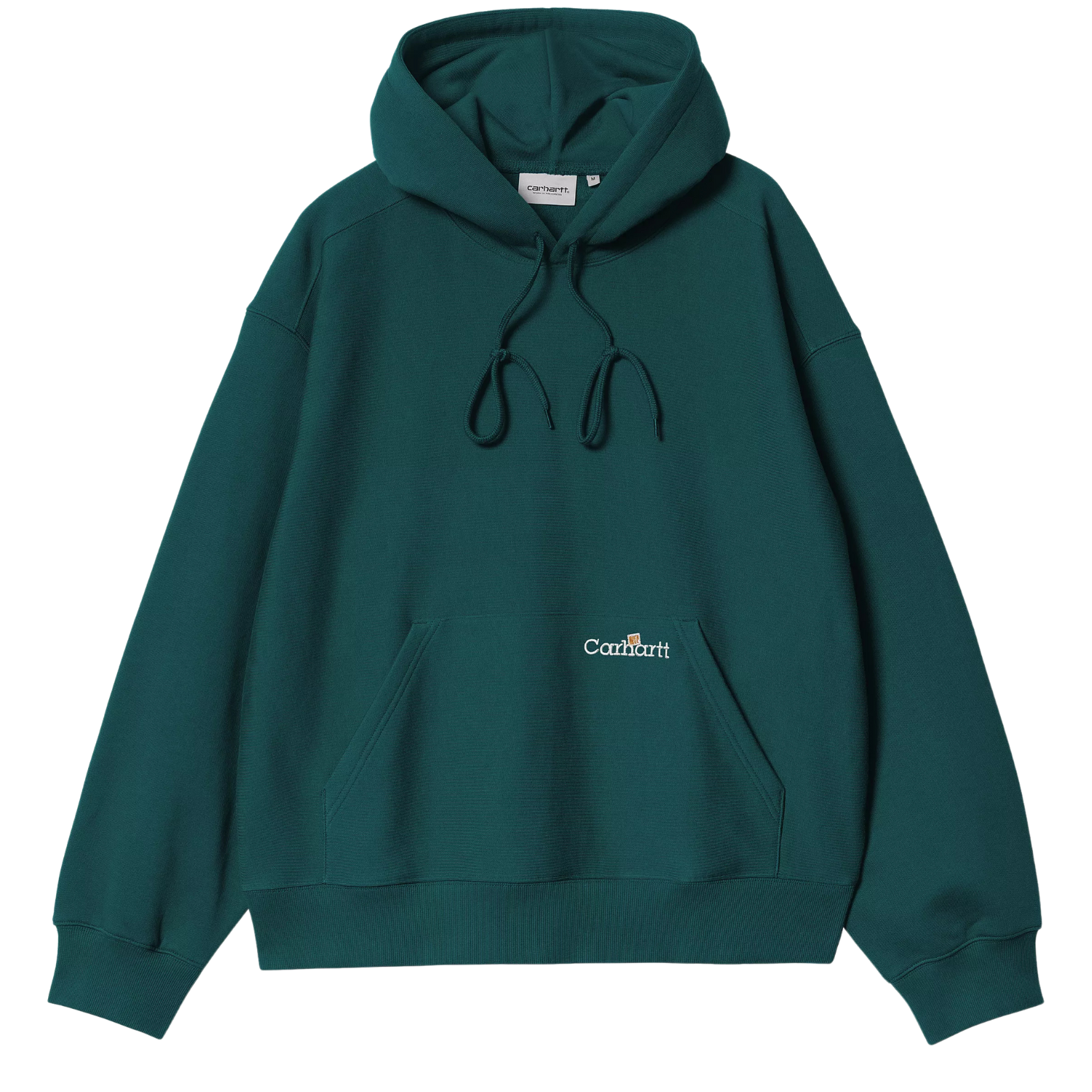 The Hooded Label Script Sweatshirt is made from a heavyweight, brushed cotton jersey with a fleece-like backing. The item has a balloon fit, which is a little looser and boxier, but also characterized by dropped shoulder and rib-knit trims, offering a cinching effect. Graphic embroidery appears on the front.