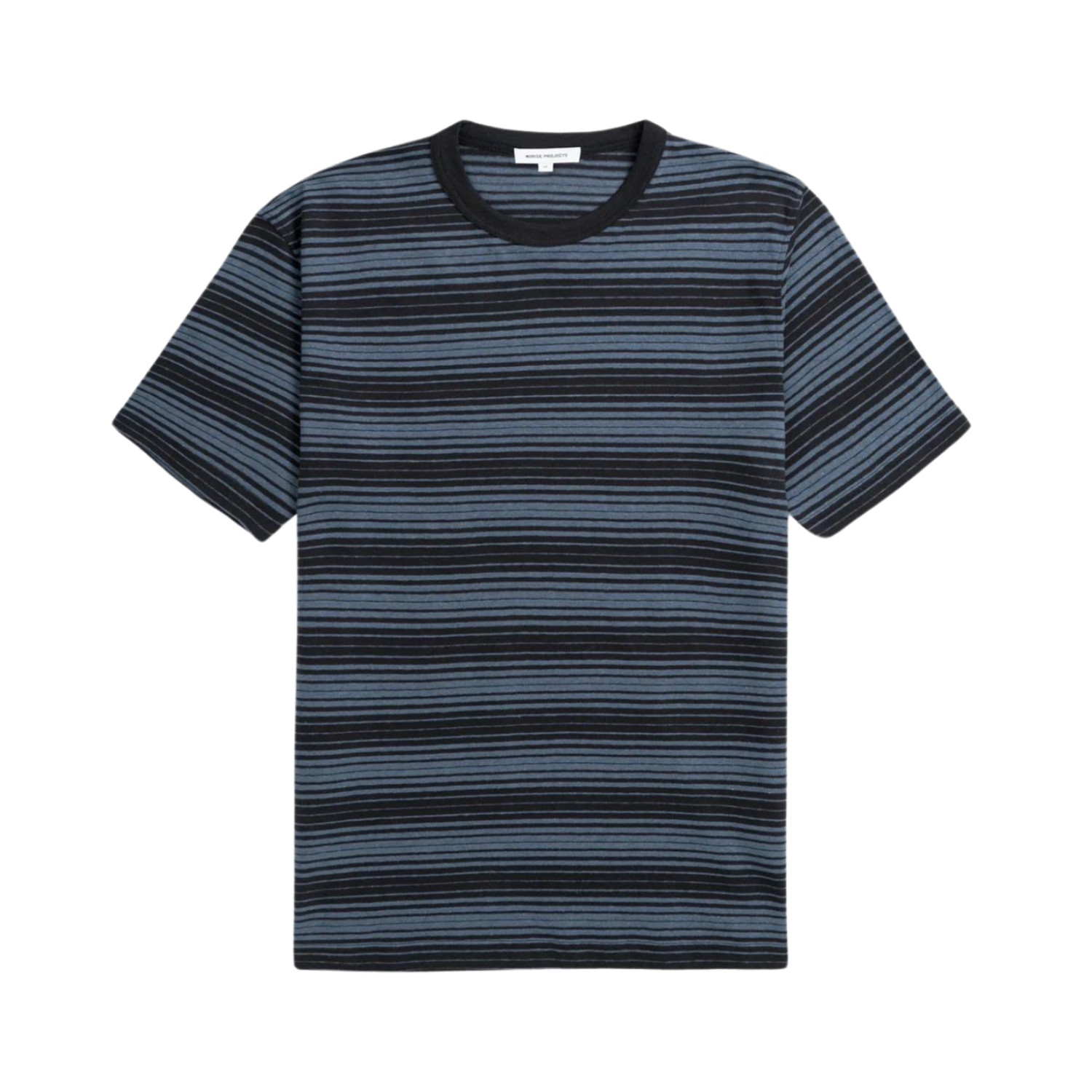 A regular fitting t-shirt cut in a boxy fit, constructed from a lightweight cotton/linen blend jersey in a seasonal stripe and finished with a self-fabric bound collar with twin needle stitching and a double stitched hem and cuff. The natural properties of linen fibres allow heat to escape, making it the perfect choice for summer.