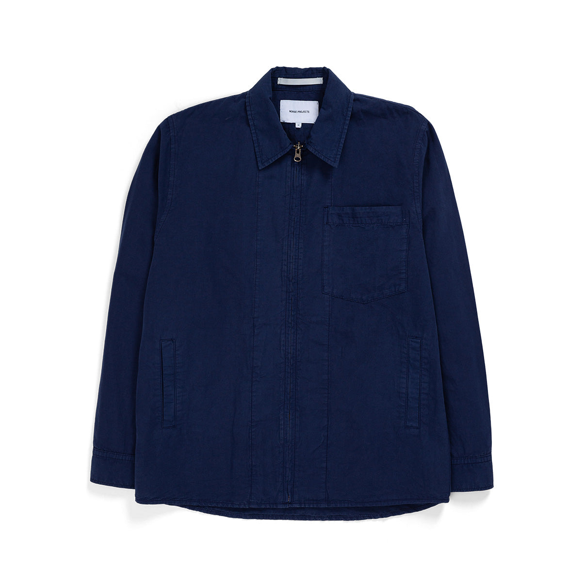 The Julian Cotton Linen is constructed from a mid-weight slub twill cotton linen. Features include a zip front, large chest pocket, side welt pockets, and stitched front facing details.