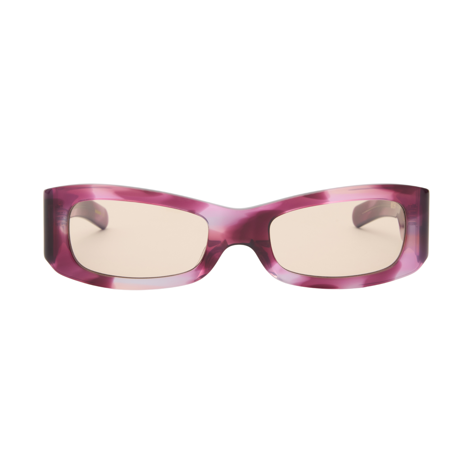 The Kareem sunglasses feature a pink patterned frame crafted from 100% handmade Italian Mazzucchelli acetate. The brown gradient Carl Zeiss lenses provide UVA/UVB protection. Designed for durability, the sunglasses include stainless steel, nickel-free OBE hinges with silicone safety screws.