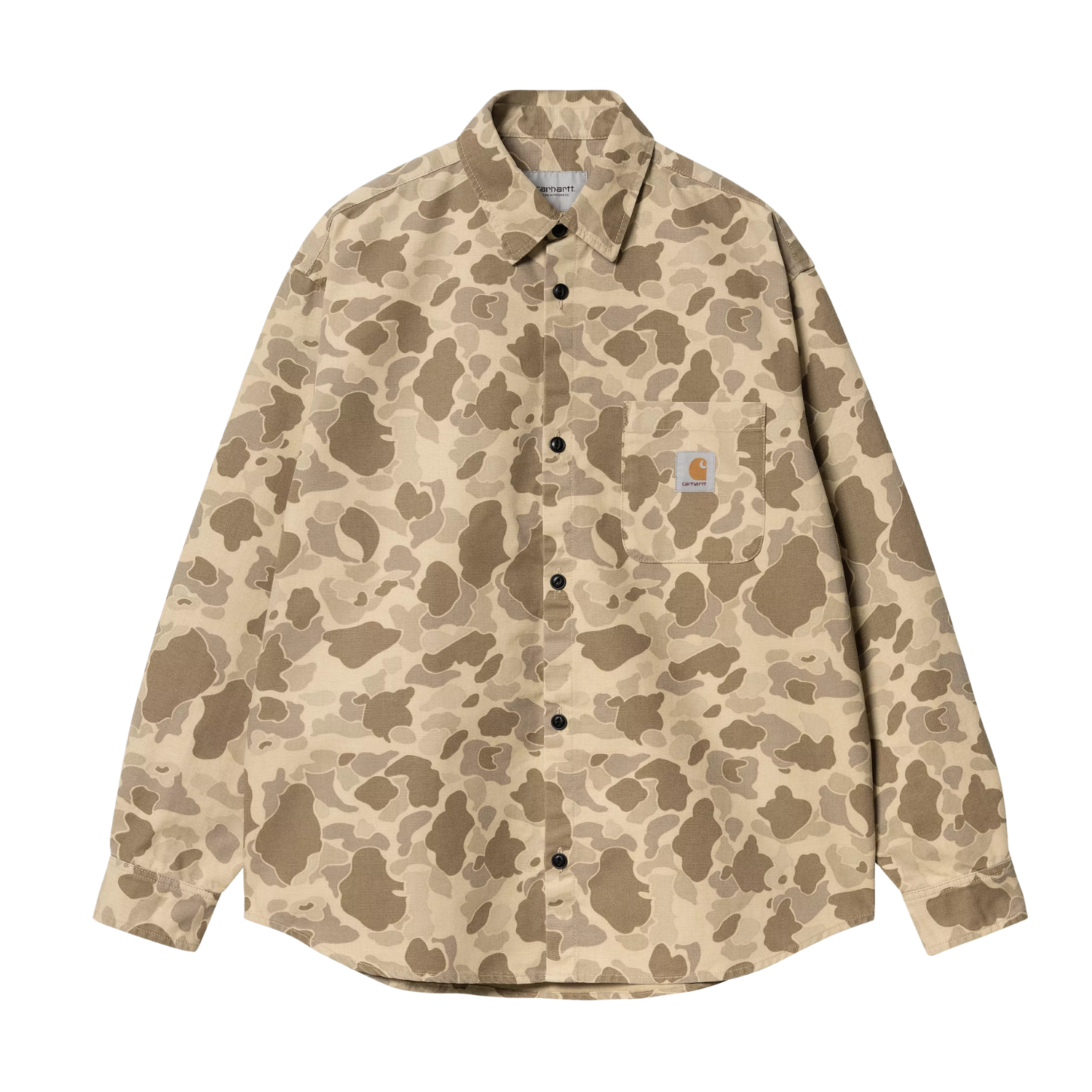 The L/S Duck Shirt is made in a loose fit from midweight cotton canvas featuring an allover camouflage print. The item has also been garment-dyed for a softer feel and complex color configuration. A woven Square Label appears on the chest pocket.