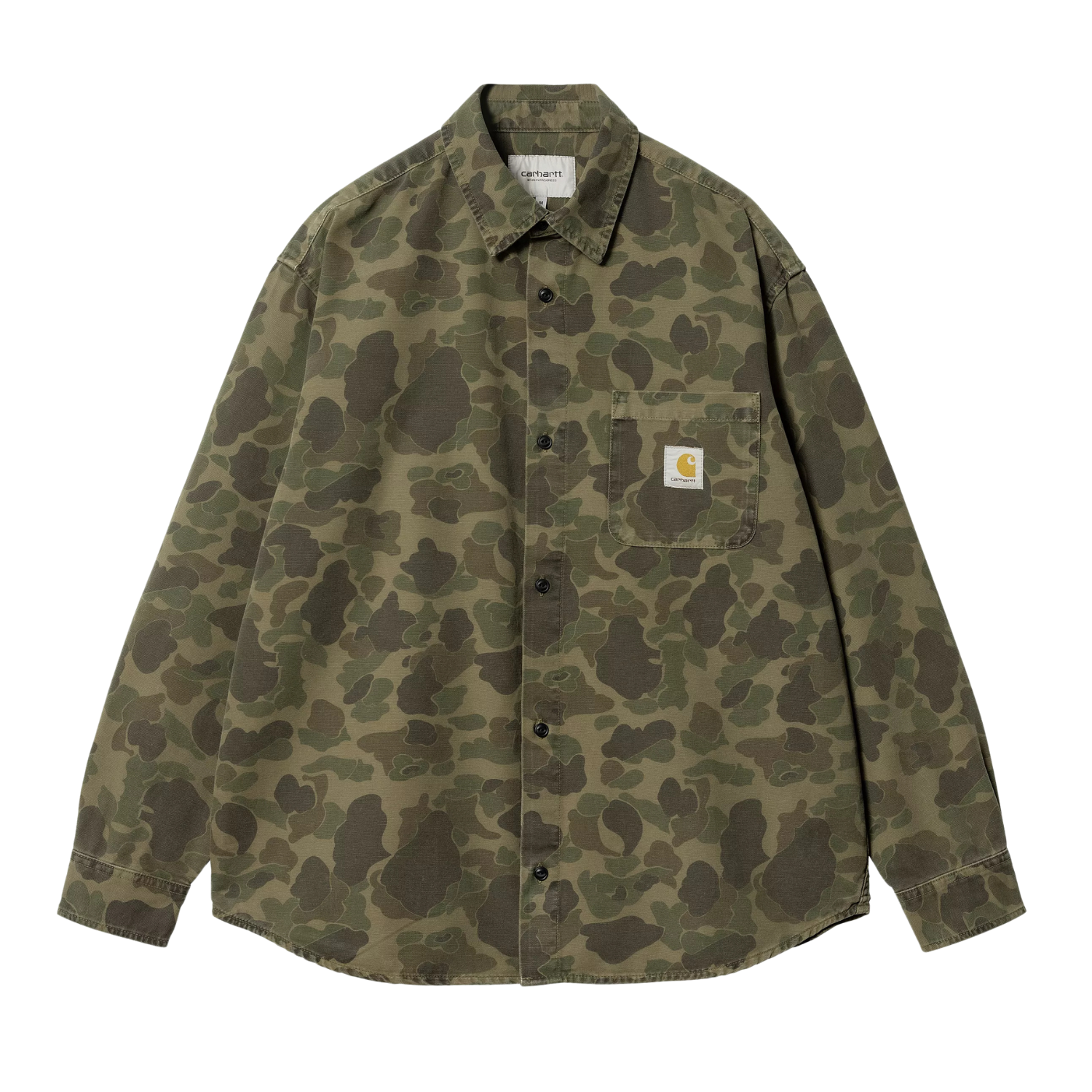 The L/S Duck Shirt is made in a loose fit from midweight cotton canvas featuring an allover camouflage print. The item has also been garment-dyed for a softer feel and complex color configuration. A woven Square Label appears on the chest pocket.