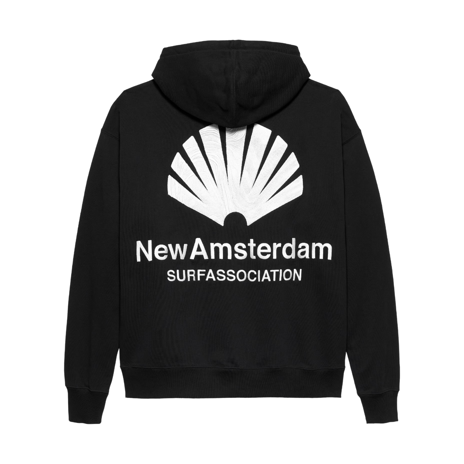 Hooded sweater, cut to a relaxed unisex fit. Detailed with the classic New Amsterdam logo embroidery on the front and back, made using two different colored yarns and varied embroidery structures. This hoodie is made out of a heavyweight 455 GSM garment-dyed cotton.