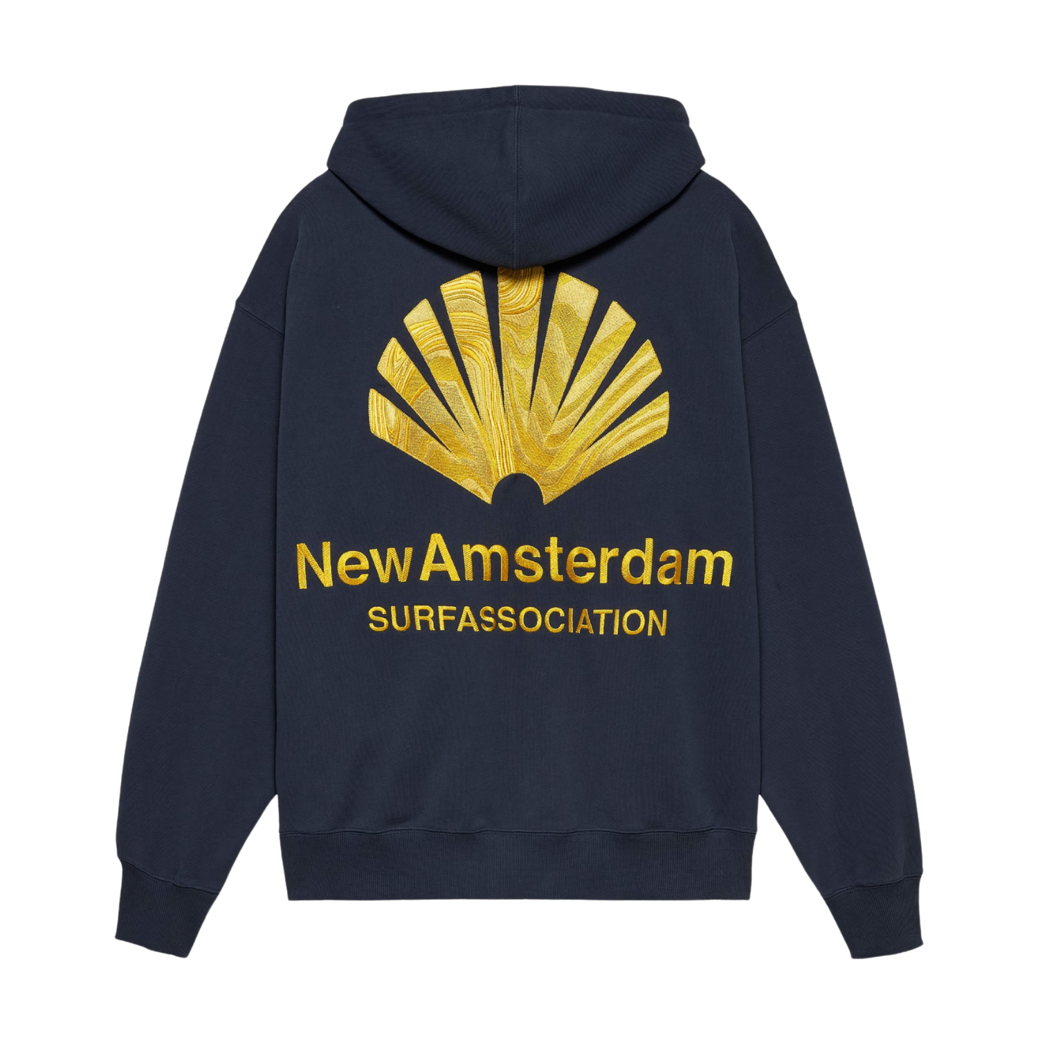 Hooded sweater, cut to a relaxed unisex fit. Detailed with a special New Amsterdam logo embroidery on the front and back, made using two different colored yarns and varied embroidery structures. This hoodie is made out of 100% heavyweight cotton.