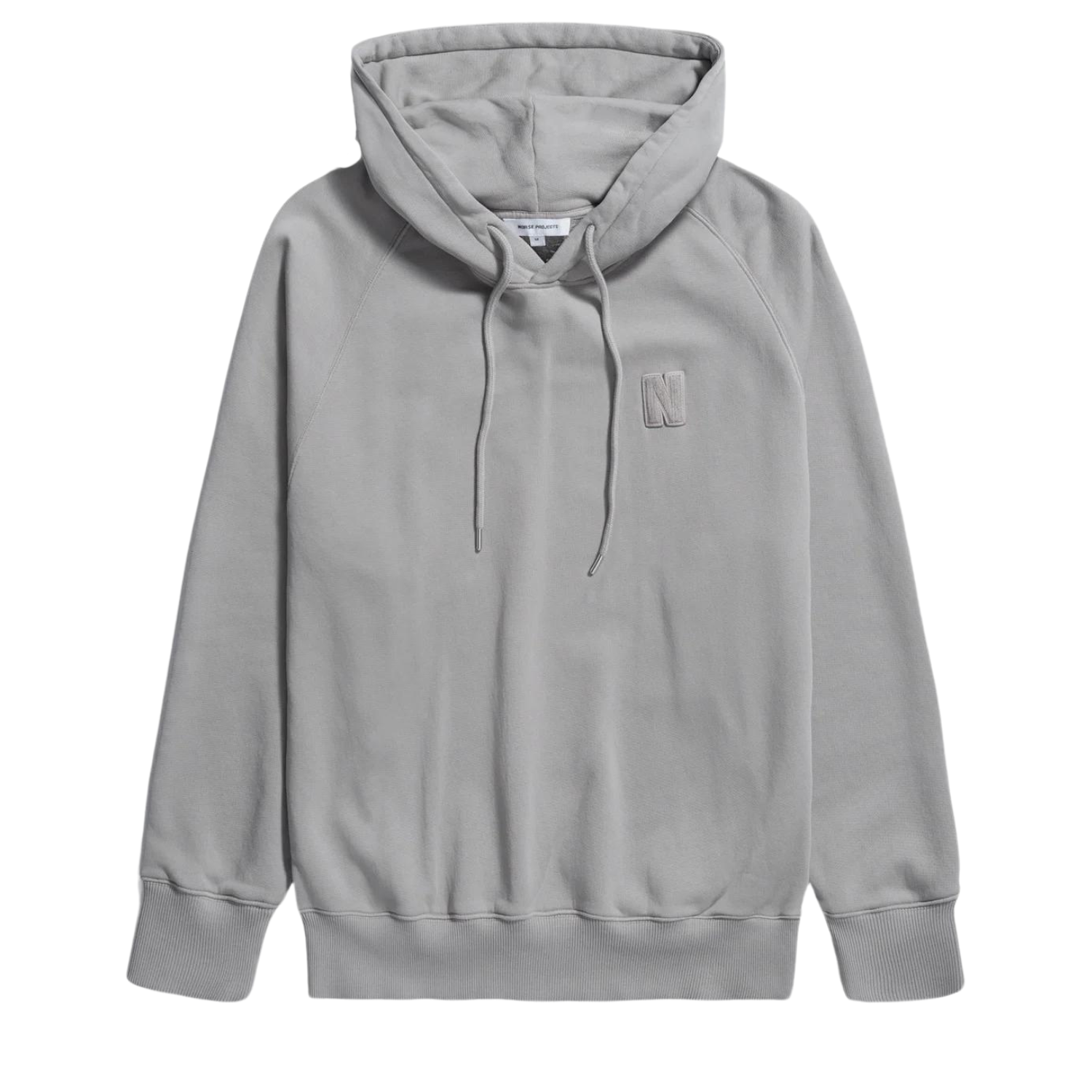 A relaxed fitting hoodie constructed in a brushed back sweat quality made of organic cotton featuring raglan sleeves. The style is garment dyed with a logo patch on the chest. It is finished with a tighter rib at cuffs and hem and twin needle stitching details.
