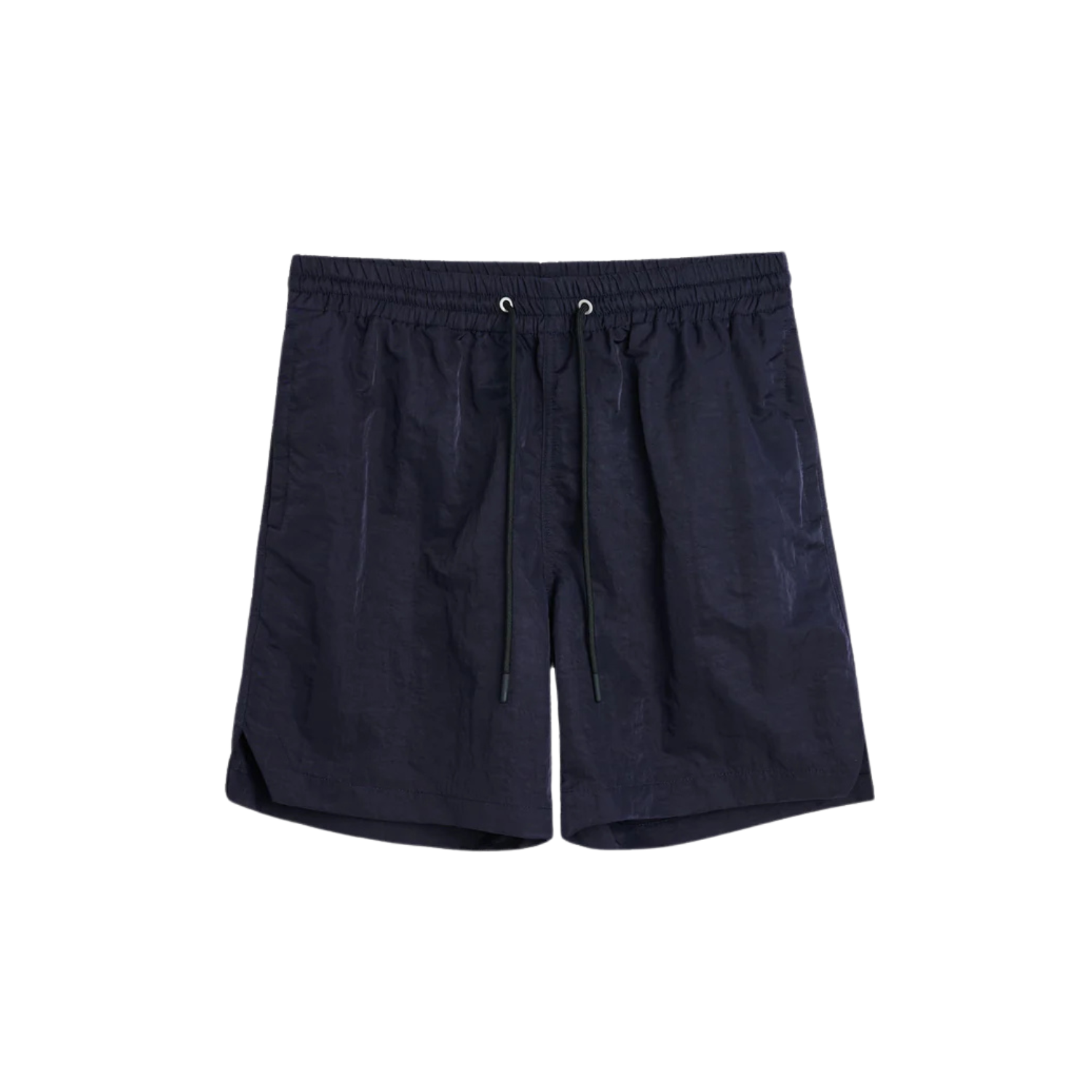 Crinkled nylon taffeta shorts. These shorts are made of lightweight nylon fabric, providing a comfortable fit even in hot weather. The waist has banding and string details, making them comfortable to wear and move around in. The length is just above the knees, making them a stylish item that can be used in various situations, such as everyday life and water play.