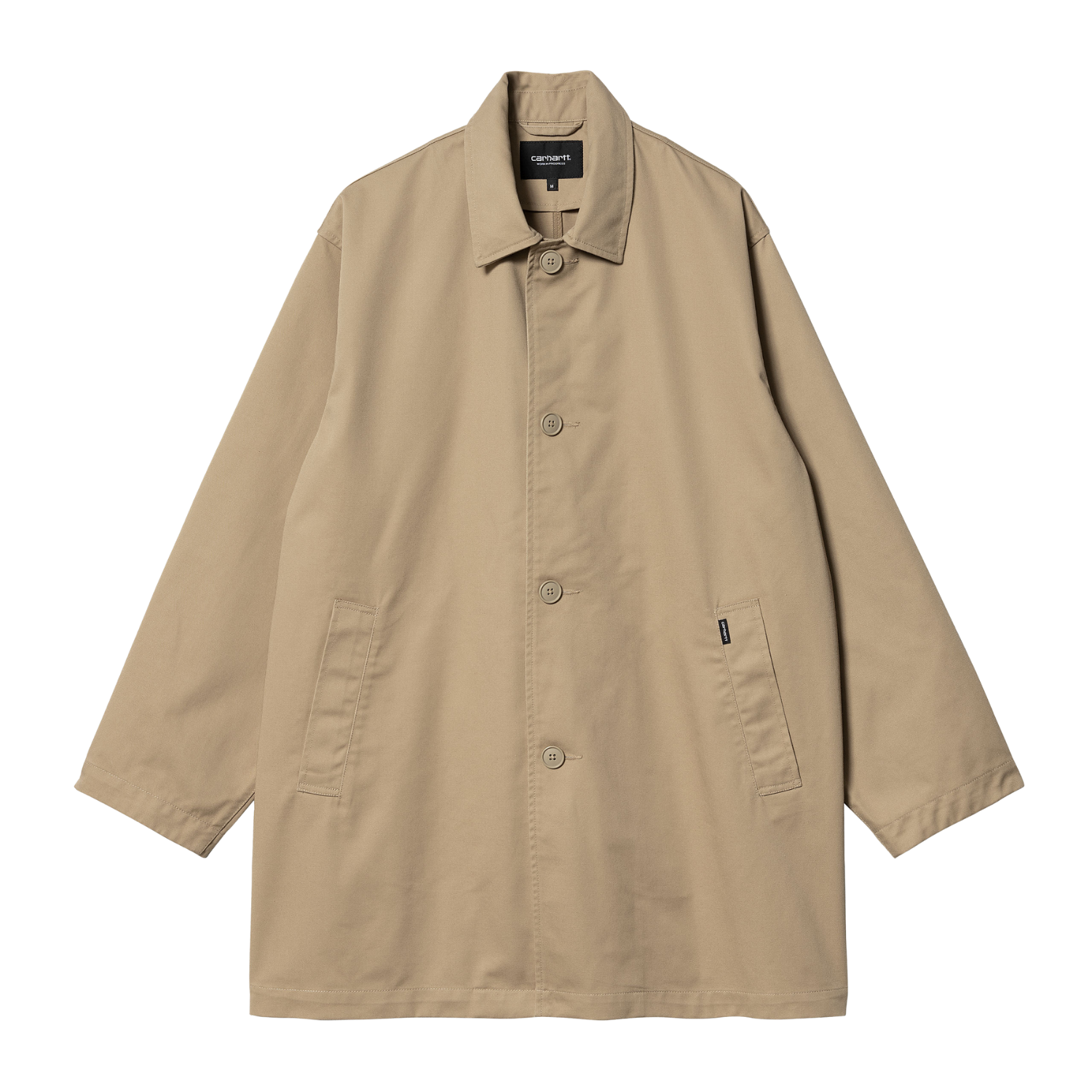 The Newhaven Coat is inspired by a classic car coat silhouette and is constructed from midweight, poly-cotton twill. The item is also unlined. It features a collar, a buttoned front, and two welt pockets. A woven flag label completes the design.