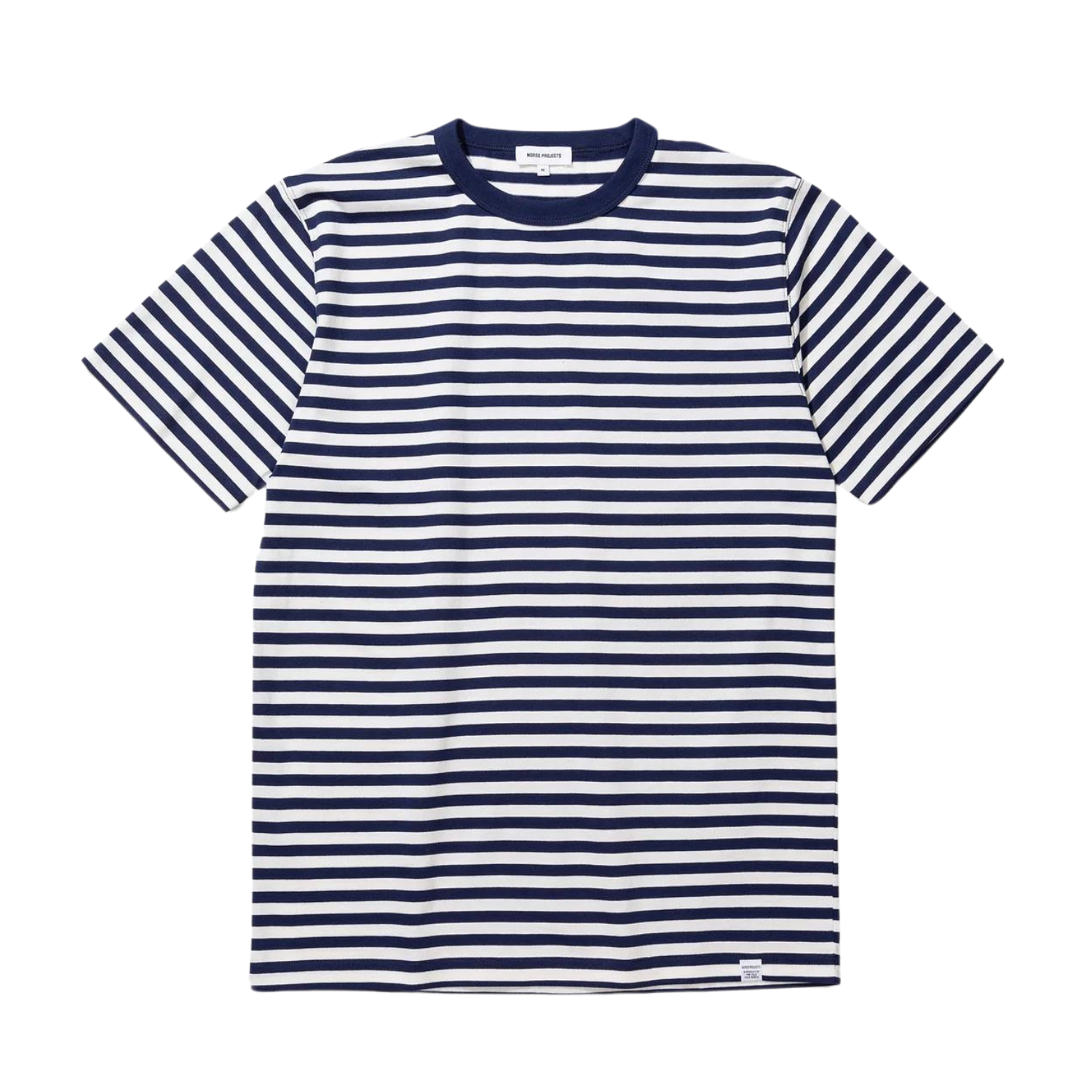 The Niels Classic Stripe SS is cut in a midweight organic cotton jersey with a simple stripe pattern. The t-shirt is finished with set-in sleeves, contrast ribbed binding around the neck and twin needle stitched cuffs and hem.