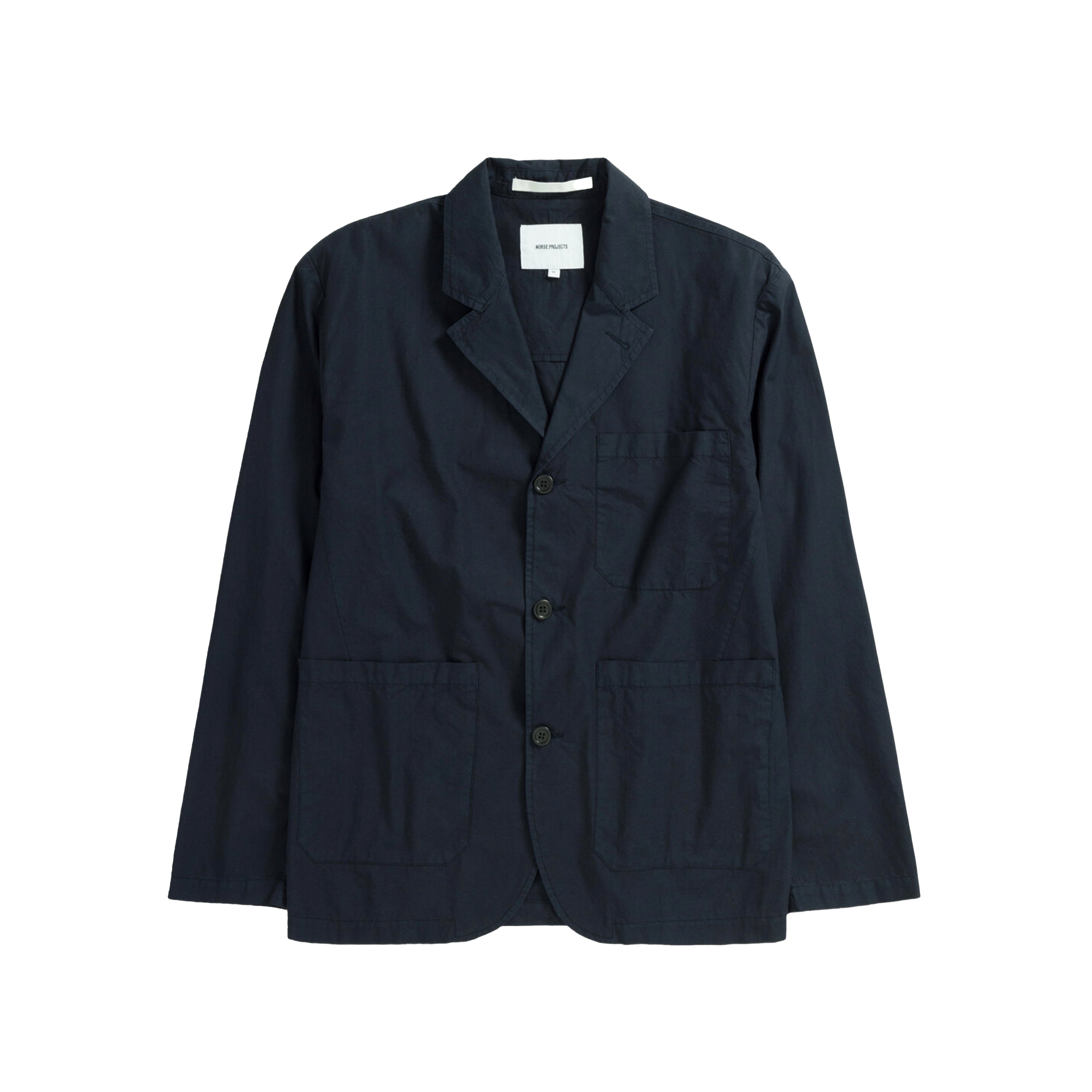 A relaxed work jacket constructed from a lightweight and crisp cotton typewriter cloth. This jacket features patch pockets with clean stitching, and corozo button closure. This style is garment dyed and is cut with unstructured shoulders and chest, designed to be worn casually.