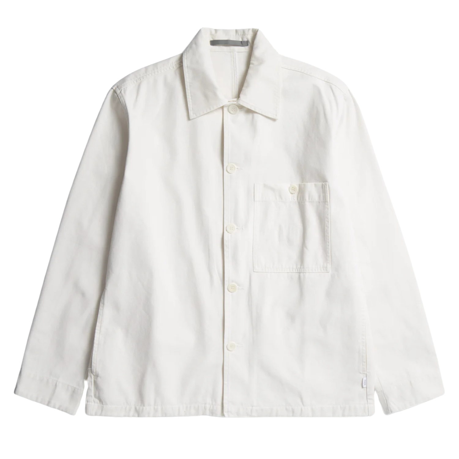 The Norse Standard Twill Overshirt is cut from Italian densely woven twill, offering a clean, defined structure and a straight, boxy fit. It can be worn as an overshirt or lightweight jacket. It features a single patch pocket on the chest, side seam pockets, corozo buttons and branded tab at the chest pocket.