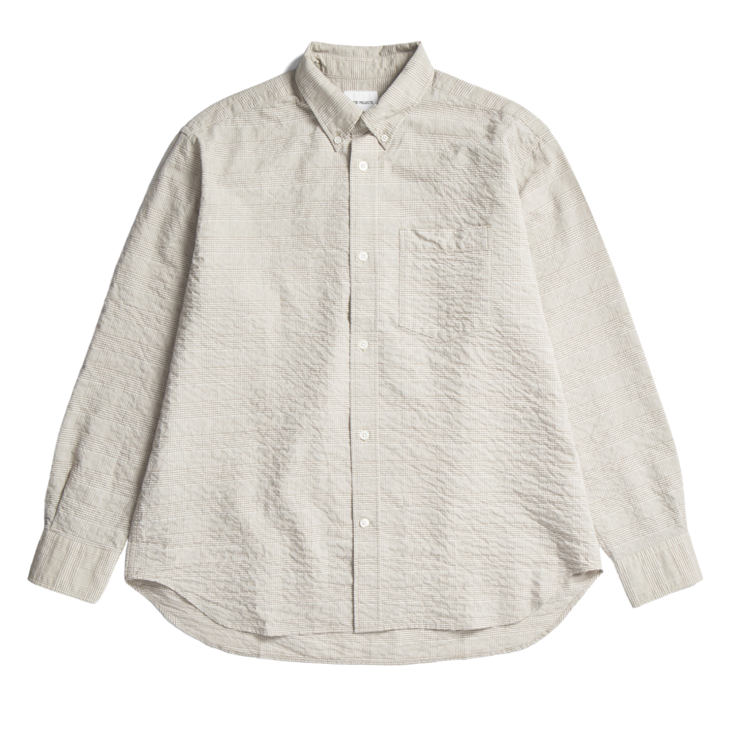 An oversized fitting shirt, with a wider cut body. This flannel checked shirt is constructed in a wool blend Italian fabric with a slight crinkled appearance. This shirt is finished with a chest pocket and mother of pearl buttons.