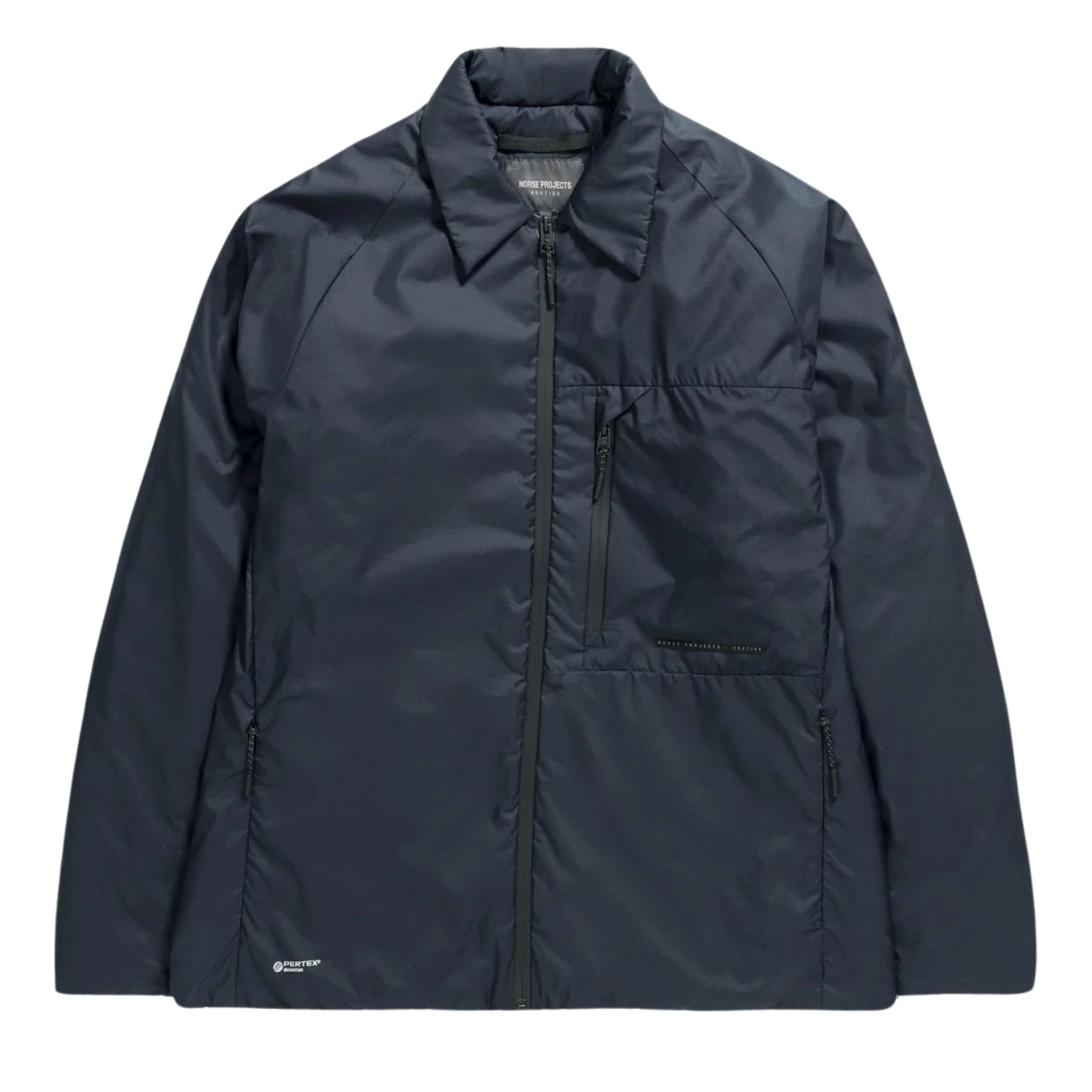An insulated shirt jacket utilising Pertex® Quantum technology; a technical fabric that uses a tightly woven structure to provide a light and soft windproof fabric that allows insulation to fully loft. This construction is designed to trap still air and improve the efficiency of insulation. This textile is 50% recycled and finished with a PFC free DWR finish that sheds light rain and snow to provide additional protection. Features include a raglan sleeve cut for movement, a front chest pocket with water repellent PU coated zip front. This jacket has a hidden back attachment strap making it compatible to wear with Norse shell pieces.