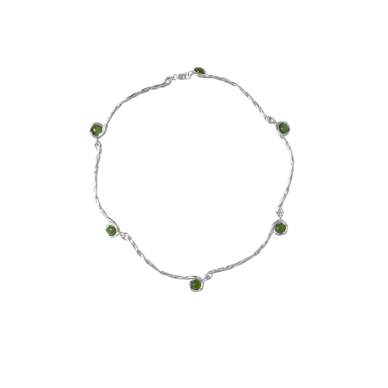 Handmade necklace in recycled sterling silver with six twisted links adorned with round nephrite jade stones. This is a smaller version of their classic lago necklace. Petite lago jade necklace is a part of corali's cadence collection and a family of many lago pieces. The necklace has a classic lobster clasp closure.