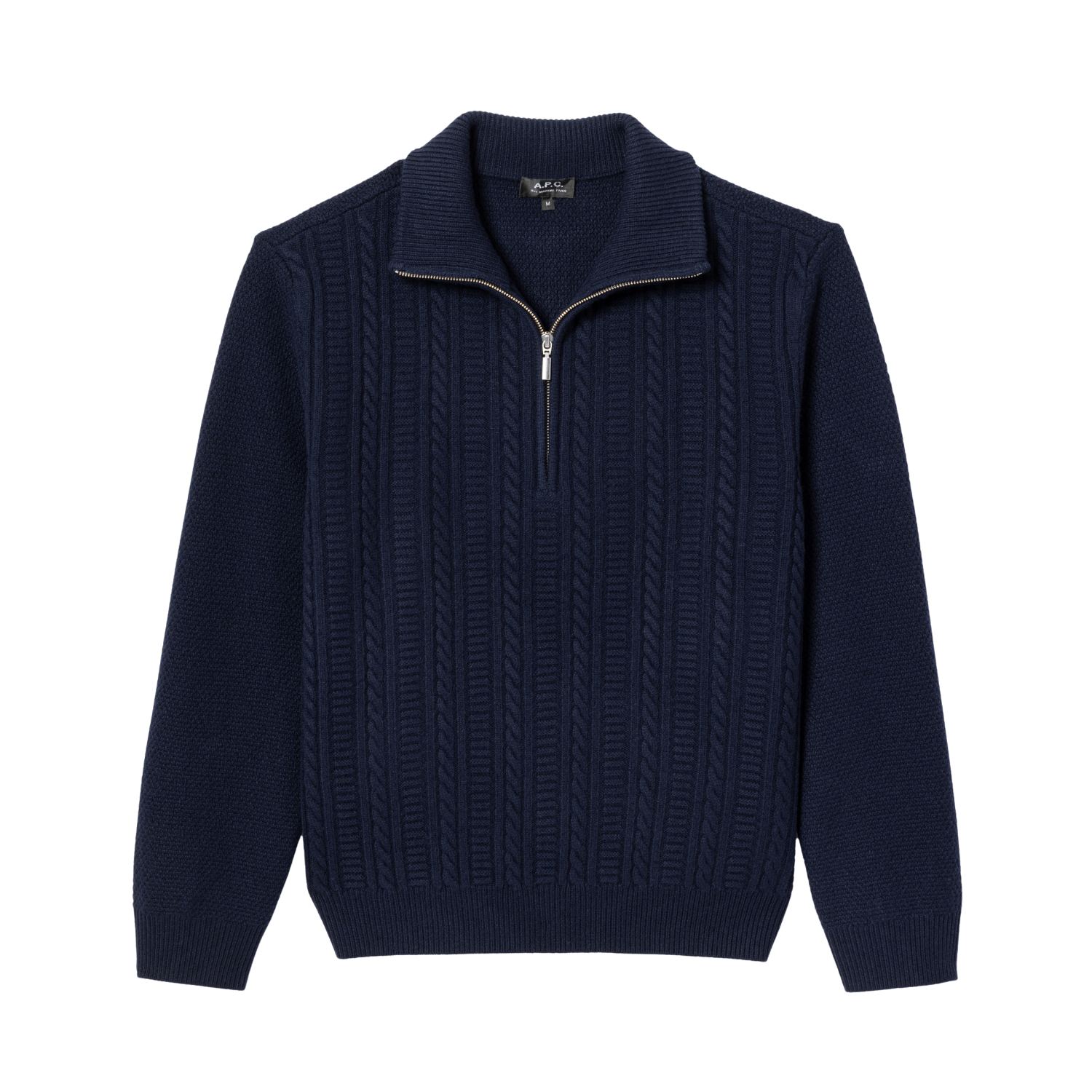 The Pull Theo in Dark Navy by A.P.C. is a refined half zip crewneck sweater made from a soft, premium 100% virgin wool. This piece features a slim fit and subtle ribbed detailing at the cuffs, hem, and zip-up collar, creating a sleek silhouette.
