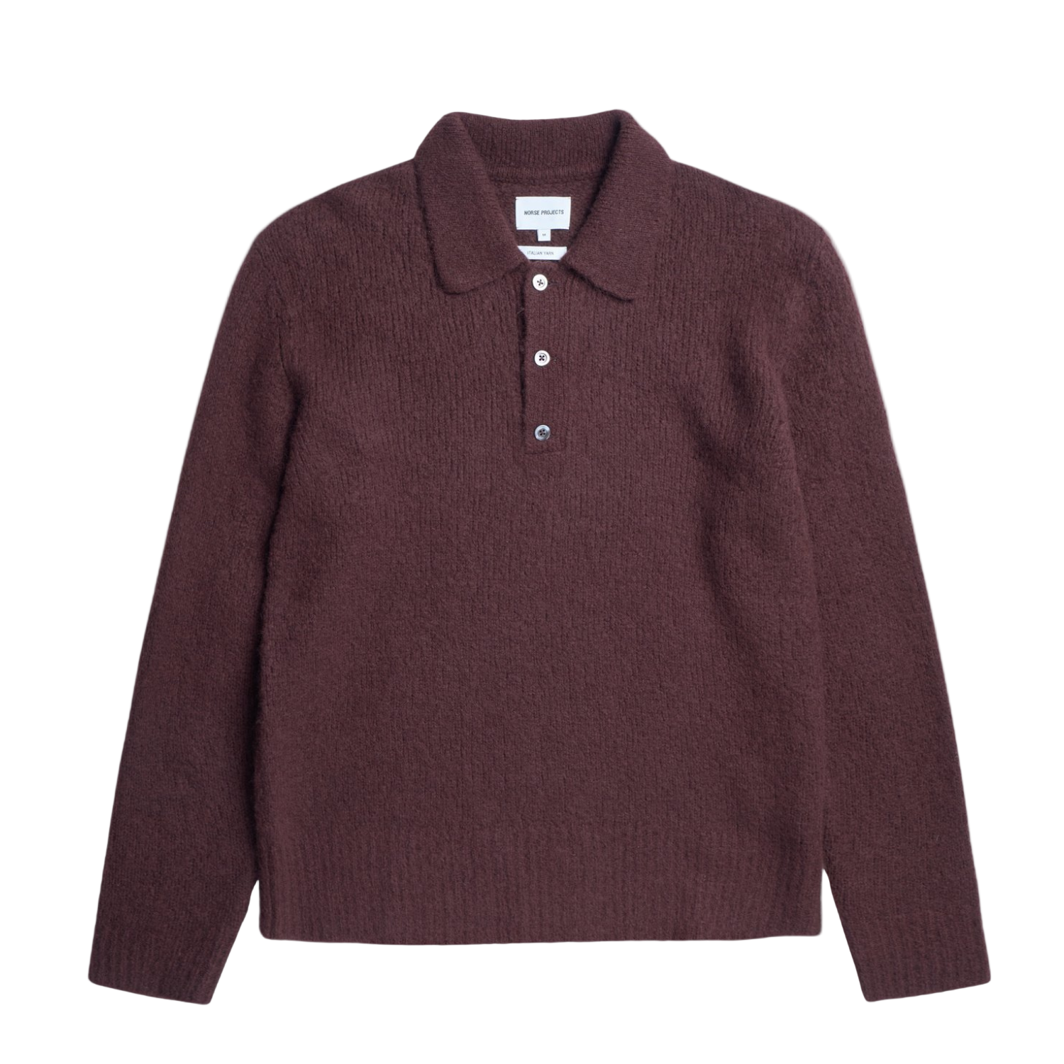 A polo knitted from an alpaca/wool blend in plain jersey. The relaxed fitting style is constructed with set-in sleeves, 2 button placket and finished with ribbed cuffs and hem.