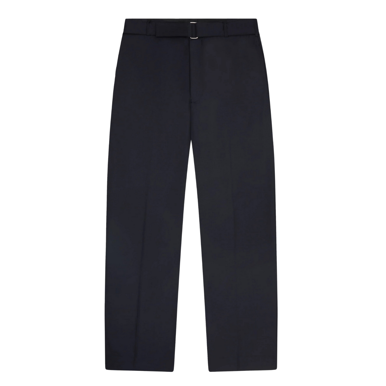 A relaxed tailored trouser cut in structured midweight wool blend suiting. The relaxed belted trouser features a removable self-fabric belt with silver D-ring buckle, clean on-seam pockets, and jet back pockets with tonal branding embroidery.