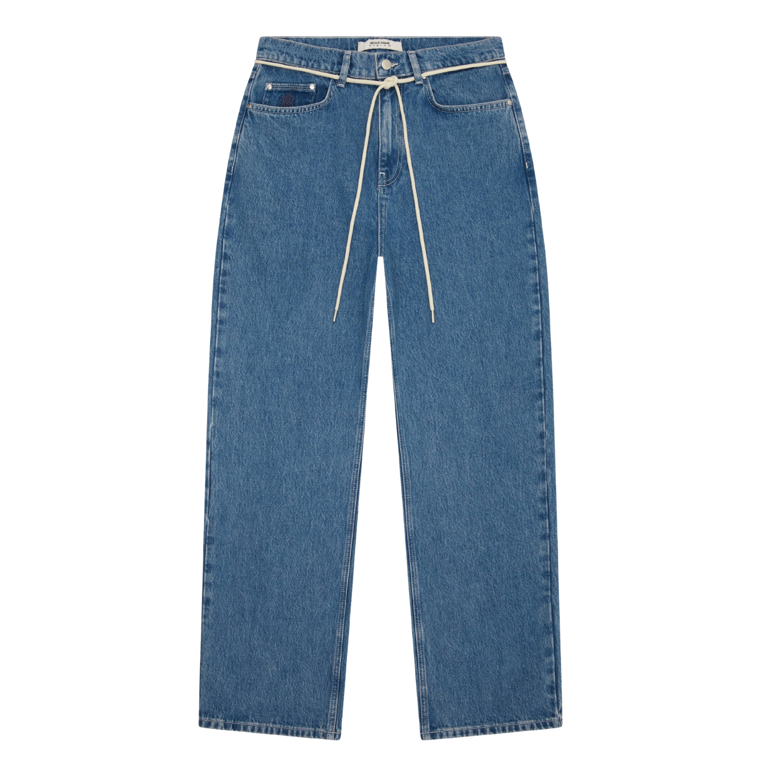 about:blank's new relaxed denim block is a baggier silhouette than their previous denim offer. The jeans feature a 100% cotton denim weave, twin back pockets, and an embroidered ":" detail on the back pocket. The denim has a white branded back detail and is finished with a removable shoelace string.