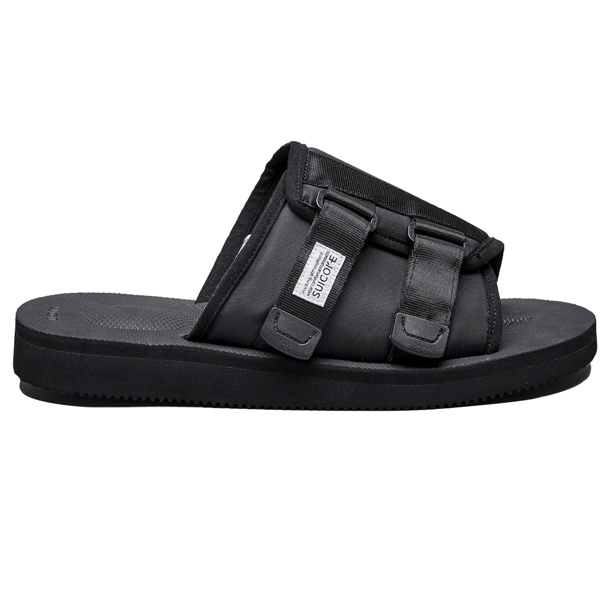 Simple Suicoke slip-on design with a matte black nylon upper overlayed with adjustable Velcro tabs. Using the brands antibacteral EVA footbed for additional comfort.