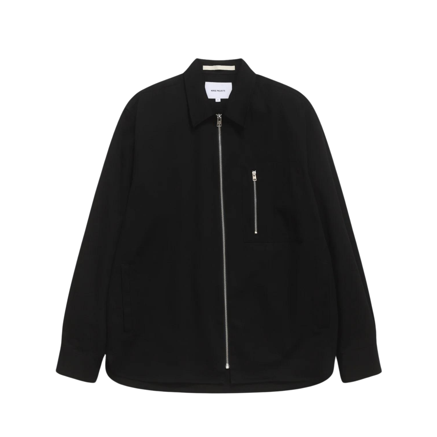 A relaxed overshirt constructed from a premium high twist Italian twill. Featuring a zip front, large chest zip pocket, and lower welt pockets. Finished with a shaped hem, and ring snap closures on the cuff.