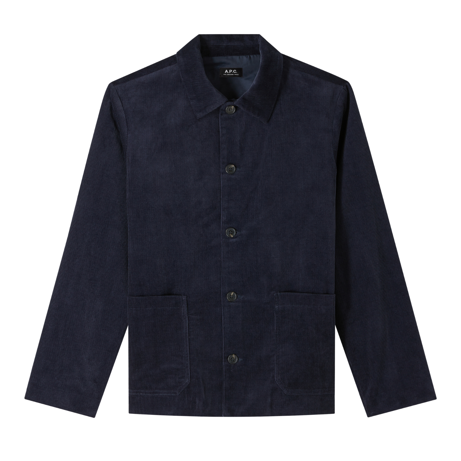 Midnight blue workwear jacket in Italian cotton corduroy from A.P.C. with button closure. It has a straight cut, classic shaped collar and two front patch pockets at the bottom of the jacket.